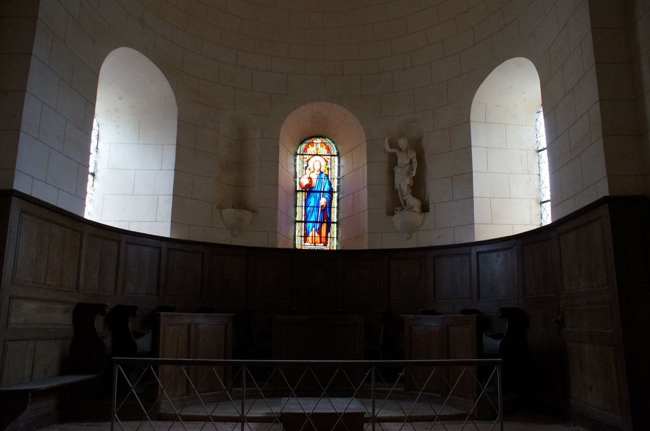 Derrière l’autel, une pierre tombale d’un seul bloc nous montre Isabeau de la Plesse, Dame du Bouchet, allongée les mains jointes avec un chien à ses pieds. Il y a une inscription qui nous indique « Jour de Décembre prier pour l’âme… »