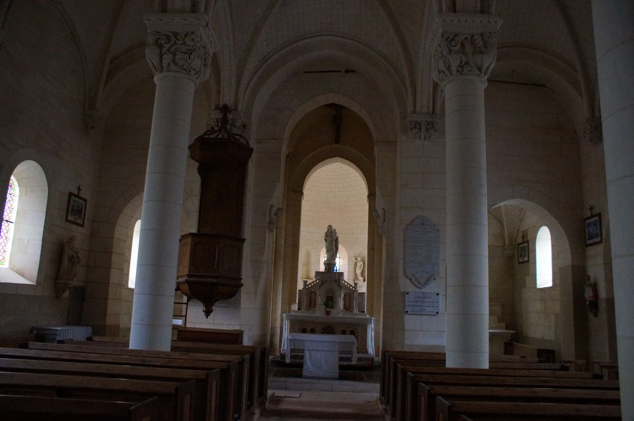 la nef est dédoublée par un double rang de colonnes romanes.